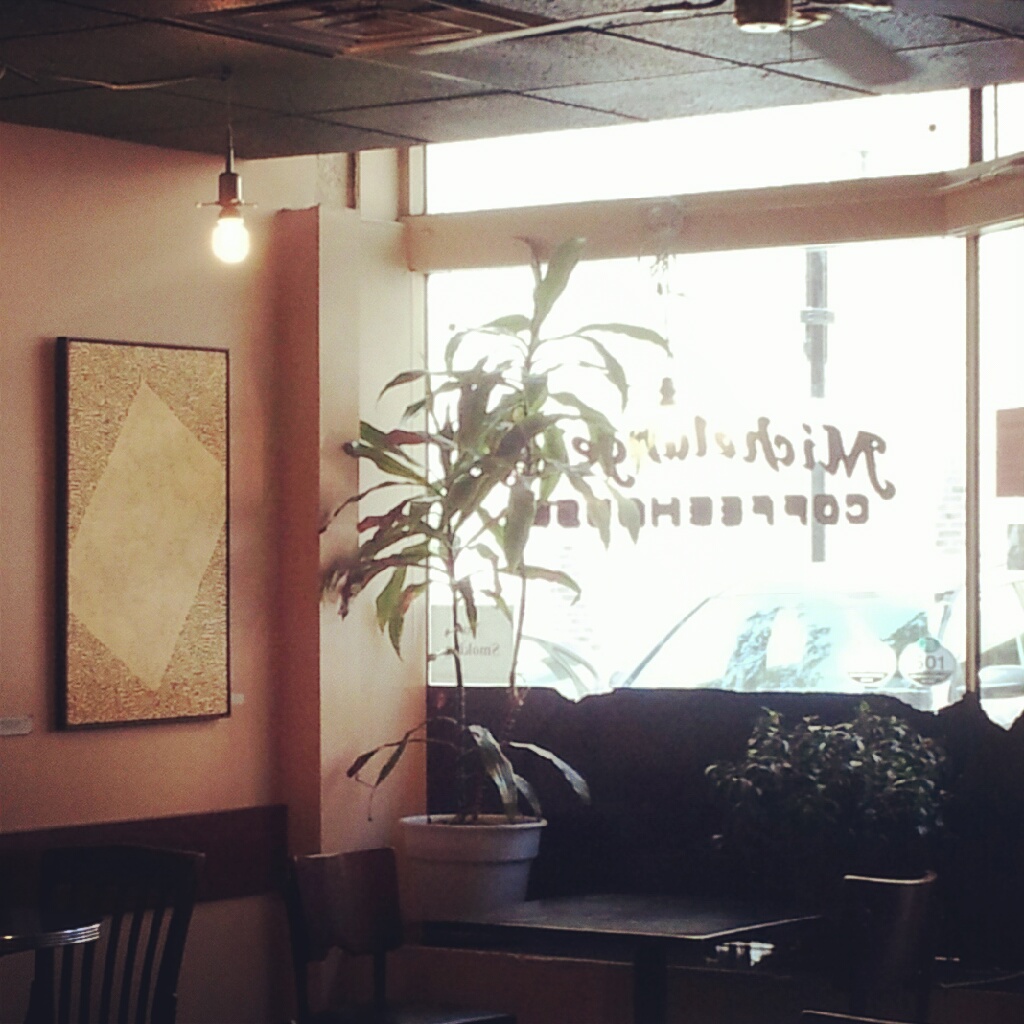 Music plays softly in the background of this eclectic and comfortable cafe – its yellow walls adorned with abstract art. I look around. Faces. Worn, happy, concerned and engaged. It’s amazing how much someone can tell you through a single glance. Light bounces off the adjacent, red brick building and delicately streams through the large windows, as if it were meant to create the relaxed ambience of this place. The wooden door, probably reclaimed from the building’s past life when it housed a bank or a mom and pop shop, squeaks distinctively, swinging back and forth as the last of the lunch crowd leaves. Aside from the two middle aged women reconnecting about their lives and the college student sitting in front of them, the back side of the cafe is now empty. Above me, a fan spins almost imperceptibly as it hangs mounted on the green ceiling tiles. Its blades gently pass through the air, creating a slight breeze that lazily mixes with the distanced laughter of unseen individuals at the cafe’s storefront. My wandering eyes begin to trace the ceiling edge running against the far wall – here, green meets yellow as each stops abruptly before the other, curiously beholding and complementing each other’s difference.